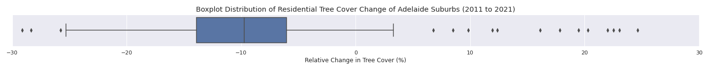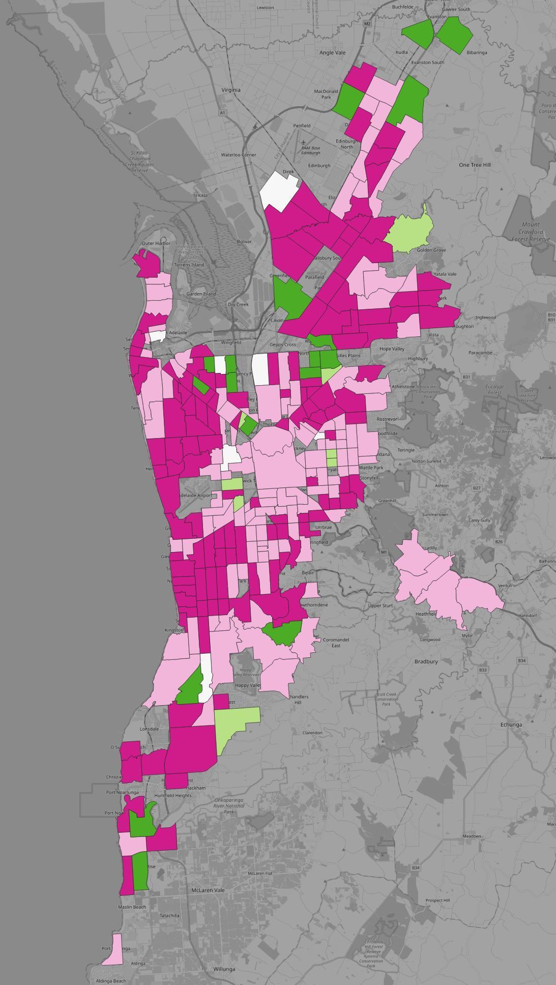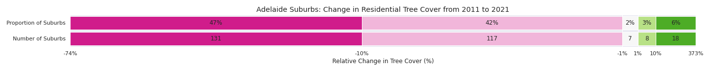Adelaide-wide statistics are provided on the suburbs as a group. In general, the statistics and graphs describe the count of the suburbs (e.g. 18 suburbs with >10% gain in residential tree cover). For these, the area of the suburb is not taken into account. This means that a larger, less densely populated suburb carries the same weight as a smaller urban one, again to focus better on the lived experience of residents.