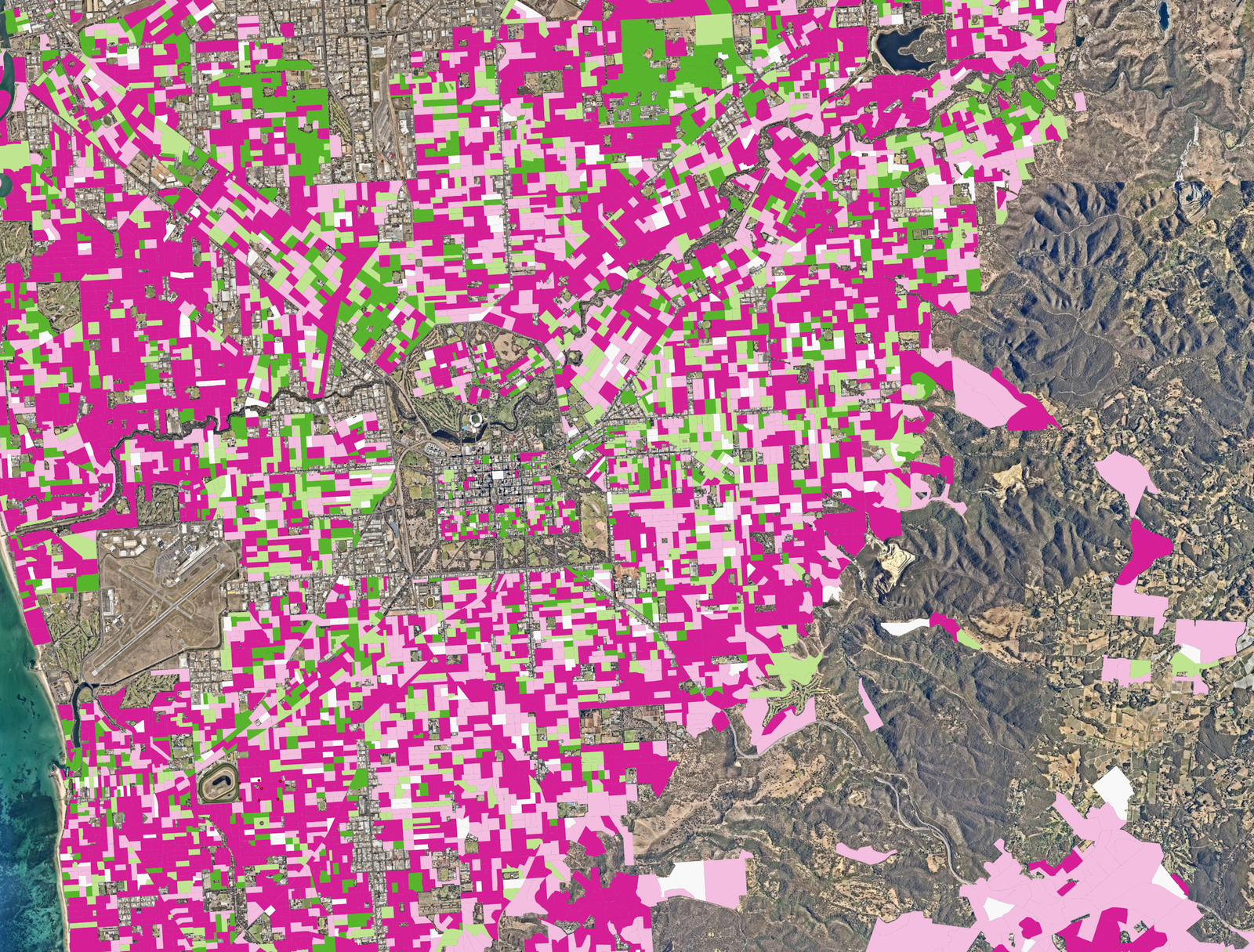 Covering the 10-year span from 2011-2021, we analysed the changes in residential tree canopy across 281 suburbs in Adelaide.* Rather than a comparison across only two dates, which risks artefacts in one date skewing the result, we used seasonally-matched data from nine distinct points in time across the decade to confirm any trends.
